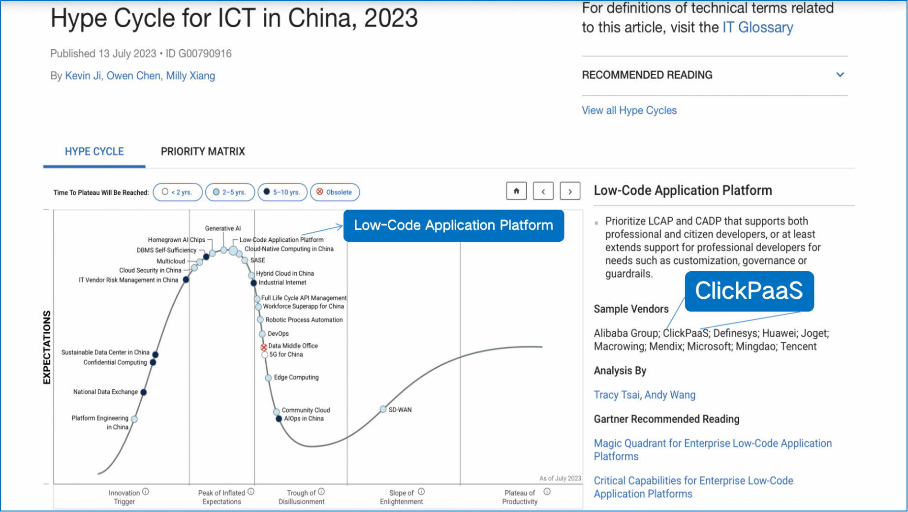 Gartner《2023中国ICT技术成熟度曲线》报告发布,pg电游站入选低代码平台代表厂商
